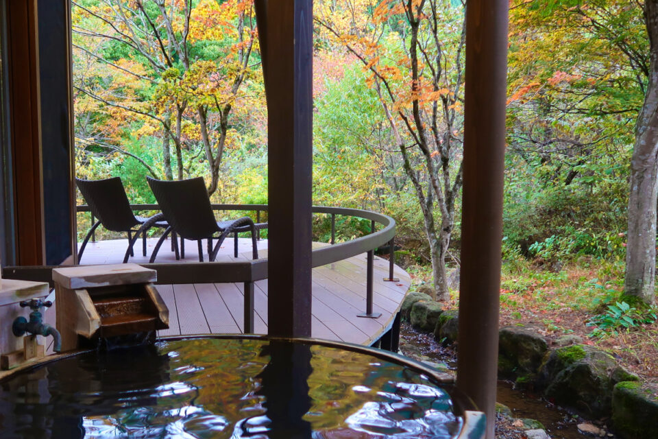 Book Yukemuri no Yado Inazumi Onsen in Akinomiya Onsen (Akita)―― A hidden retreat nestled at the foot of Mt. Kurikoma, renowned for its autumn foliage. The ryokan offers a variety of guest room types, including ones with private hot springs. Notably, the four detached accommodations named “Ten no Za” were designed by a renowned architect and feature open-air hot springs and indoor cypress wood baths. The facility includes large gender-segregated baths and two private open-air hot springs. Dinner features traditional Japanese kaiseki dining that incorporates seasonal ingredients from Akita, while breakfast also offers traditional Japanese dishes.